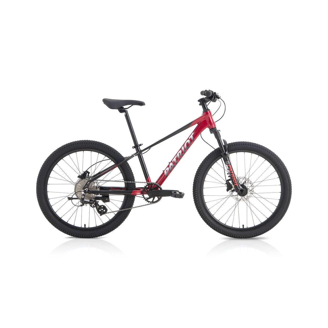 The Patriot Rocky 24″ offers young riders a durable hydroformed alloy frame, 100mm suspension fork, hydraulic disc brakes, and smooth Shimano 8-speed shifting. Grippy 24×2.3 tyres handle pavement, dirt paths, and playground adventures confidently. With an included kickstand and compact geometry, it delivers trail-ready fun and everyday reliability for growing cyclists.