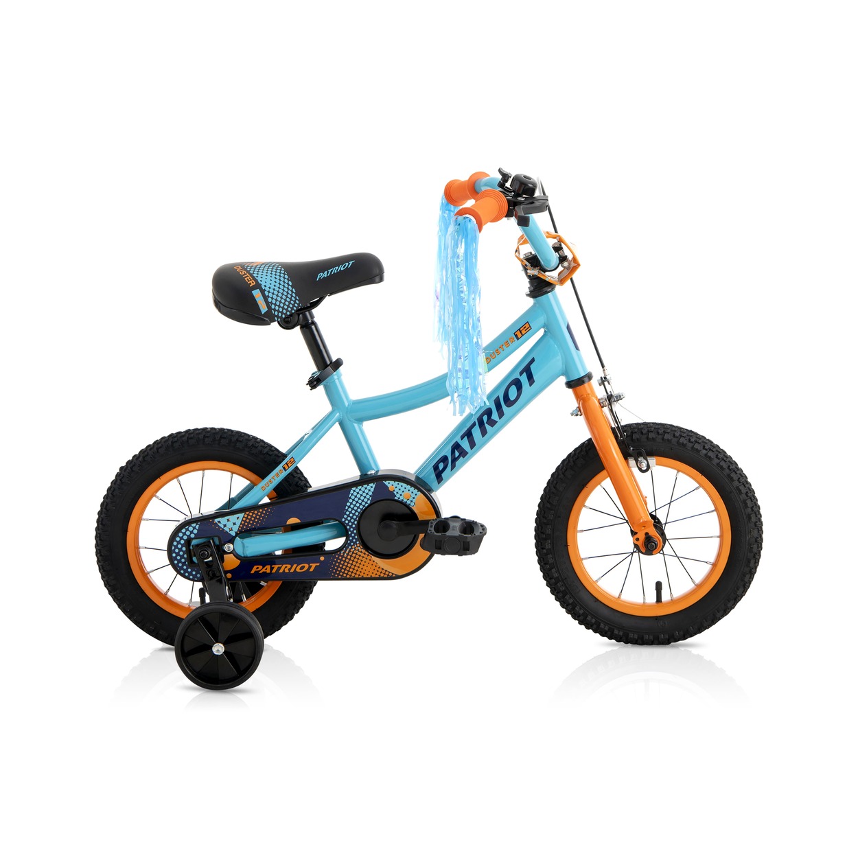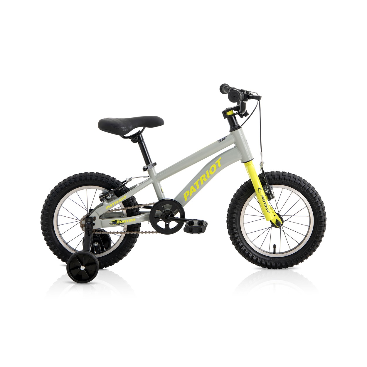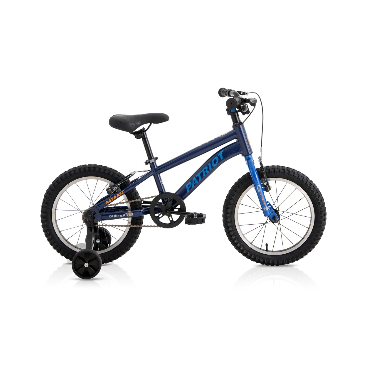 The Patriot Duster 16 inch kids bike supports children ages 5-7 (105-120cm tall) with removable sidewheels, V-brakes, and single-speed design. Its steel frame and steel wheels handle playground adventures confidently. This durable Duster 16″ bike builds balance and control safely