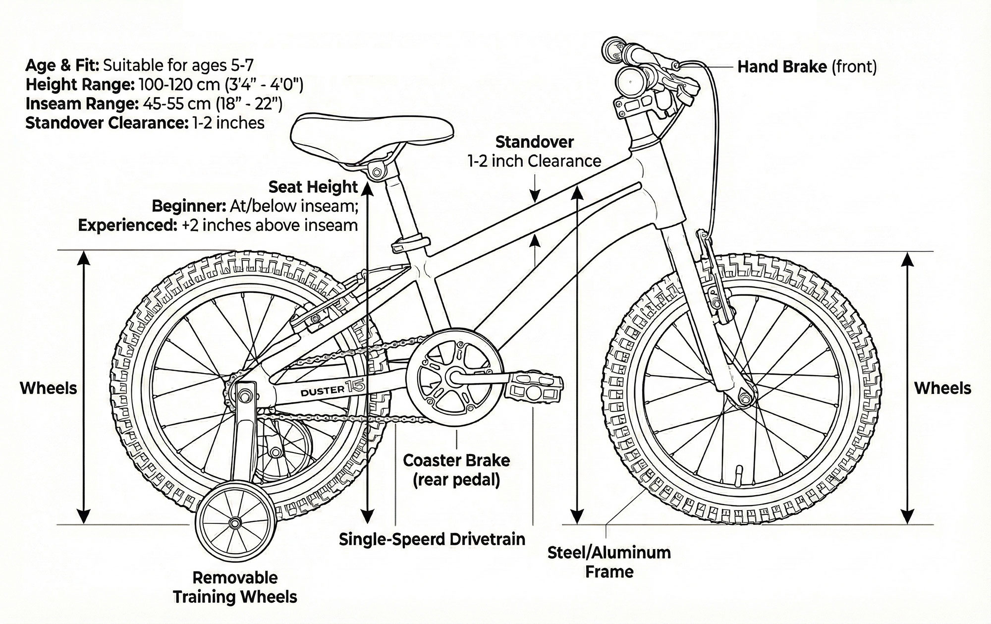 The reliable V-brakes provide responsive stopping power, while the simple single-speed design keeps riding easy and stress-free. Built with a strong steel frame and durable steel wheels, the Duster is tough enough to handle playground adventures, park rides, and everyday excitement.